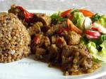 Gulasz z grzybami i kaszą 219500 g mięsa (łopatka) garść grzybów suszonych 1 papryka czerwona 1 cebula 2 ząbki czosnku 1 szkl rosołu 1 łyżka smalcu sól pieprz pieprz ziołowy staropolski