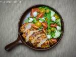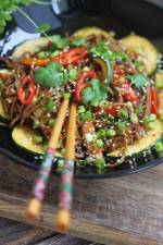 Makaron soba z wieprzowiną i warzywami 183lubicie cukinii? Żaden problem, dodajcie brokuł lub fasolkę szparagową i też będzie super. Sama jeśli korzystam z przepisów, traktuję je dość luźno. Takie gotowanie, na luzie, to sama przyjemność. Składniki: 500 g mięsa wieprzowego (łopatka lub karkówka) 300 g makaronu soba pieprz sól 1 czerwona cebula 2 ząbki czosnku 3 cm korzenia imbiru 1 papryczka chili 1 czerwona papryka(...)szczypiorkiem świeża kolendra papryczka chili pokrojona w plasterki Przygotowanie: Mięso kroimy w paski i oprószamy pieprzem. Czosnek i imbir drobno siekamy, pozostałe warzywa kroimy w plasterki. Makaron gotujemy według instrukcji z opakowania, po czym przepłukujemy zimną wodą. W rozgrzanym woku lub na dużej patelni podsmażamy na oleju sezamowym przez 30 sekund: czosnek, imbir i chili. Następnie dodajemy marchewkę