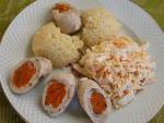 Dietetyczne roladki z indyka z marchewką i tymiankiem 341stron. Marchewkę pokroić na krótkie paski. Na każdy rozbity sznycel ułożyć 2-3 paseczki ugotowanej marchewki i posypać tymiankiem. Następnie zwinąć w roladkę. Potem gotowe roladki ściśle zawinąć w folię spożywczą. Końce dobrze skręcić i zawiązać nitką aby powstałe "cukiereczki" nie rozpadły się podczas gotowania. Następnie roladki zawinięte w folię wrzucić na wrzątek i gotować ok 25-30 minut. Gotowe