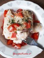 Sandacz pieczony 283świeżych pomidorów z czosnkiem, pachnący masłem i świeżym koperkiem. Aromaty, które w kuchni ubóstwiam! Rybę podałam z puree z selera i ziemniaków oraz gotowanymi brokułami. Podajcie ją z puree ziemniaczanym , z surówką z kiszonej kapusty i marchewki lub z surówką z marchewki . Polecam przygotować taką rybę na świąteczny obiad. Będzie pysznie! Zapewniam! Smacznego Sandacz (filet ze skórą) pieczony z dodatkiem