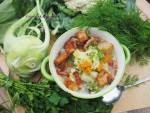 Zupa warzywna z grzankami i boczkowymi chipsami 215warzywami w sam raz na letnie upały. Samku dodają również paprykowe grzanki i paski boczku. 3 l wody 300 g udek z kurczaka Pęczek włoszczyzny (por + natka pietruszki) 2 marchewki 3 młode ziemniaki 1 kalarepa 1 kalafior 1 brokuł 300 żółtej fasolki szparagowej 1 łyżka przyprawy uniwersalnej typu Vegeta 2 łyżeczki posiekanego koperku 2 ząbki czosnku 1 łyżeczka liścia lubczyku(...)łyżeczka ostrej czerwonej papryki Oliwa z oliwek 500 g surowego boczku wędzonego W dużym garnku gotujemy wodę i udka z kurczaka. Dodajemy włoszczyznę. Gdy udka są już miękkie wyjmujemy je, obieramy i kroimy na mniejsze kawałki. Dodajemy z powrotem do garnka. Marchewkę obieramy i kroimy w pół plasterki. Ziemniaki i kalarepę w kosteczkę. Kalafiora oraz brokuł dzielimy na małe