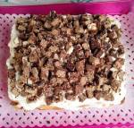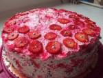 Truskawkowy raj 188śmietany 30% 2 białe czekolady 2 kubeczki mascarpone Spody do tortów kakaowe tryskawki do ozdobienia 2 łyżeczki kawy 10 dag orzechów włoskich(...)wystygnięcia ,następnie śmietanę ubijam na sztywno i dodaje serki mascarpone ,orzechy włoskie posiekane ,kiedy czekolada wystygnie delikatnie wlewam do masy śmietanowej i dokładnie mieszam . Spody nasączam kawą i nakładam ubitą wcześniej śmietanę z orzechami ,po przełożeniu śmietana ,cały tort smaruje na wierzchu i boki pozostałą śmietaną i zdobię truskawkami i brokatem jadalnym i gotowe, odstawiam tort na kilka