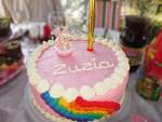 Tort tęczowy (Rainbow Cake) 194Dodatkowo (do ozdobienia tortu): ok. 400-500 ml śmietany 30% barwniki spożywcze Wykonanie: Biszkoptowe blaty: Mąkę pszenną i ziemniaczaną mieszamy ze sobą i przesiewamy. Białka oddzielamy od żółtek, ubijamy na sztywną pianę. Pod koniec ubijania dodajemy partiami cukier, łyżka po łyżce, ubijając po każdym dodaniu. Następnie dodajemy po kolei żółtka, nadal nie przerywając ubijania. Do masy jajecznej wsypujemy przesiane mąki(...)otrzymania 1/2 szklanki (ewentualnie 2/3). Poszczególne blaty ciasta nasączamy niewielką ilością cytrynowego ponczu i przekładamy kremem. Kolejność układania blatów: fioletowy, niebieski, zielony, żółty, pomarańczowy i czerwony. Wierzch i boki tortu smarujemy pozostałym kremem. Ja dodałam odrobinę barwnika czerwonego i uzyskałam piękny jasno-różowy odcień. Wierzch tortu ozdobiłam dodatkowo rozetkami z bitej śmietany, a na boku zrobiłam śmietanową tęczę. Cały tort