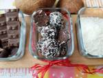 Bajaderkowe kulki czekoladowo-kokosowe 235Przepis autorski (mój). Bajaderki, czyli kulki, które powstają z resztek innych ciast. To dobry sposób na wykorzystanie nadmiaru ciasta, czy po prostu niechciany zakalec. Mi zostały blaty od tortu, a że nie miałam ochoty na następne większe słodkości - tak powstały pyszne kuleczki. Co prawda różnią się one od typowych bajaderek, ale są tak smaaaczne, że może nawet i lepsze(...)tych uroczych "pralinek". Możecie użyć dowolnego ciasta, ale pamiętajcie, że nie może być ono z kremem, ani owocami. Efekt finalny też jest uzależniony od rodzaju naszej bazy. Dodatkowo do masy można dodać ulubione bakalie lub dowolny olejek zapachowy. (około 16 sztuk) 300g biszkoptu kakaowego (*) 4 łyżki masła (płaskie) 4 łyżki oleju kokosowego 3-4 łyżki cukru (w zależności