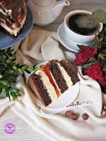 Budyniowy torcik z mlecznym kremem i galaretką 223upieczeniu studzimy i koimy na 3 blaty. Krem: W garnku zagotowujemy mleko z cukrem i cukrem waniliowym. Odstawiamy do całkowitego wystudzenia. Masło (w temperaturze pokojowej) ubijamy na puszystą masę. Stopniowo wlewamy wystudzone mleko. Cały czas ubijając wsypujemy partiami mleko w proszku. Ucieramy jeszcze chwilę, aż krem będzie jednolity i gładki. Galaretkę rozpuszczamy we wrzątku. Odstawiamy do wystygnięcia i delikatnego stężenia(...)kąpieli wodnej rozpuszczamy czekoladę i masło. Gdy całość jest gładka wlewamy śmietankę. Naczynie zdejmujemy znad pary i energicznie mieszamy aby czekolada się nie zważyła. Jeszcze ciepłą polewą oblewamy tort. Dekorujemy orzechami laskowymi