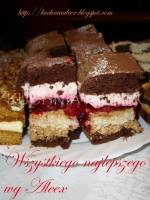 ”Wszystkiego najlepszego” wg Aleex 244nazwą: Wszystkiego najlepszego”. Ciasto jest pyszne – łączą się w nim różnorodne smaki, które znakomicie się komponują: czekolada, kokos, kawa, wiśnie i śmietanka. Jest wysokie, z powodzeniem może zastąpić tort, i dość pracochłonne. Zdecydowanie odpowiednie na specjalne okazje. Gorąco polecam z życzeniami dla babć, dziadków i Agnieszek. Składniki: Biszkopt kakaowy: • 6 jajek – osobno żółtka i białka • 1 szklanka cukru(...)łyżeczki proszku do pieczenia Krem: • 300 g masła w temperaturze pokojowej • 6 łyżek cukru pudru • 2,5 łyżki kawy rozpuszczalnej • 50 g zmielonych orzechów włoskich • 3-4 łyżki spirytusu Masa wiśniowa: • 900 g mrożonych wiśni • 2 spore łyżki mąki ziemniaczanej (nie płaskie łyżki, takie z małym czubkiem) • 1/3 szklanki wody • 2 łyżki cukru) Masa śmietanowa: • 1 galaretka wiśniowa w proszku