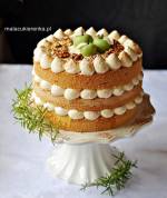 Tort „Naked” jabłkowo – orzechowy z musem morelowym 317Zapraszam na pyszny, jabłkowo – cynamonowy tort z orzechami i musem morelowym. Jest to tort z typu „naked” czyli „nagi”, ponieważ nie smarujemy masą całego tortu, nie ozdabiamy jego brzegów. W ostatnim roku był to bardzo popularny typ tortu ślubnego. Najczęściej jest ozdabiany owocami jagodowymi. Ja ozdobiłam tort jabłuszkami zrobionymi z marcepanu i posypałam go cynamonem. Tort jest wysoki i wygląda(...)wspaniale. Do tego jest pyszny i bardzo aromatyczny, fantastycznie łączy w sobie różne smaki. Bardzo polecam…. Tort „Naked” jabłkowo – orzechowy z musem morelowym Składniki: Biszkopt: 5 jajek – osobno żółtka i białka 240g mąki pszennej (użyłam tortowej) 1/2 łyżeczki proszku do pieczenia 170g cukru 1 opakowanie cukru z prawdziwą wanilią 16g lub cukru wanilinowego Mus morelowy: 200g suszonych moreli skórka starta