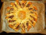 Drożdżowe słoneczko z farszem z szynką zrazową. 238dziś są moje urodziny i postanowiłam, że mój tort będzie inny niż zwykle, czyli słony :) To był bardzo dobry wybór, drożdżowa gwiazda to coś więcej niż pizza w "odmiennym" stanie. Ma zupełnie inny smak. W trakcie pieczenia doznania zapachowe są fantastyczne, a po wyjęciu z piekarnika można oszaleć, trudno się oprzeć, aby nie oderwać jednego promyka! :) Szynka zrazowa z serii(...)rosołową bez przykrycia na oleju kokosowym, aż cała woda z pieczarek wyparuje. Szynkę kroimy w dość grubą kostkę, a ser ścieramy na wiórki. Pieczarki odstawiamy do ostygnięcia, kiedy masa będzie już delikatnie ciepła mieszamy ze sobą wszystkie składniki na farsz. Zostawiamy jedynie około 50 g tartego żółtego sera, który później posłuży do posypania farszu. Ciasto dzielimy na dwie części