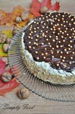 Tort z masą orzechową 246st.C przez 30-40 minut. Całkowicie wystudzić i pokroić na 3 blaty. 2. Zrobić mocny napar z herbaty i wystudzić. 3. Zrobić masę: śmietanę ubić na sztywno ,dodać cukier, a potem serek i masło orzechowe. 4. Złożyć tort: pierwszy blat lekko nasączyć(...)herbatą, posmarować dżemem porzeczkowym, wyłożyć 1/3 masy, drugi blat lekko nasączyć herbatą, posmarować dżemem porzeczkowym, wyłożyć 1/3 masy,przykryć trzecim blatem i lekko nasączyć go herbatą. Pozostałą masą posmarować wierzch i boki tortu, zrobić dekorację. U mnie boki tortu obsypane były tartą gorzką czekoladą oraz kawałkami orzechów włoskich. Tort schłodzić. *wierzch tortu przykryłam opłatkiem z rysunkiem postaci z bajki. Należy