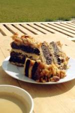 Tort płatkowy 218masą posmarować nasze wcześniej przygotowane placki, odkładając jedną sztukę do dekoracji. Masa budyniowa powinna być rozsmarowana między plackami na grubość około 0,7-1 cm. Resztą masy posmarować górną powierzchnię (fot.3) i boki tortu. Odstawić w chłodne miejsce (ale nie do lodówki), aby masa zastygła. Teraz przygotowujemy polewę karmelową do posmarowania ostatniego płatka tortu. Przygotować rondel lub patelnię z grubym(...)Płatek ciasta, który nam został ułożyć na desce do krojenia i równomiernie pokryć przygotowaną masą karmelową. Ostawić na 20 minut do lekkiego zastygnięcia a następnie pokroić na 12 równych części (fot.4). Wstawić do lodówki do całkowitego "ścięcia" karmelu. Następnie wyjąć i udekorować nim wierzch tortu