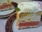 Tort holenderski z kremem Chanitylly i wiśniami 263wódką. Dodałam łyżeczkę soku z wiśni dobrze wymieszałam. Gotowy lukier rozsmarowałam na wierzchu ciasta pokrytego dżemem. Następnie gotowe trójkąty ciasta przełożyłam na talerz. Teraz zajęłam się masą wiśniową do przełożenia tortu Wiśnie osączyłam z syropu. 3/4 szklanki (ok. 180 ml) soku zagotowałam z korą cynamonu. Po zagotowaniu ją wyjęłam. Mąkę rozprowadziłam w 2 łyżkach zimnej wody(...)roztopioną żelatynę. Wymieszałam. Krem gotowy. Teraz już można poskładać tort. Na paterze położyłam jeden blat ciasta. Dookoła ciasta zapięłam obręcz tortownicy ale o mniejszej średnicy, czyli 24 cm , ponieważ ciasto francuskie podczas pieczenia się kurczy a tym samym zmniejsza się jego średnica. Ciasto posmarowałam łyżką dżemu, wyłożyłam na niego masę wiśniową i równo rozsmarowałam. Na wiśniach rozłożyłam około