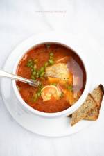 Zupa rybna z pomidorami 258część – jak to już zrobimy, potem pójdzie z górki. Składniki użyte do przygotowania rybnej są dość wykwintne (krewetki, łosoś, dorsz), więc zupa może być idealną przystawką na świąteczny lub uroczysty obiad. Ja ją uwielbiam – od razu wpałaszowałam z dużą dokładką. Mogłabym ją jeść na okrągło. Polecam – nawet tym, którzy za rybami nie przepadają. Zupa rybna z pomidorami