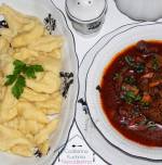 Boeuf Stroganow z kładzionymi kluseczkami 390świąteczny obiad podaję z reguły coś, czego nie gotuję zbyt często. Do takich potraw należy właśnie boeuf Stroganow. Potrawa ta została wymyślona w XIX wieku przez francuskiego kucharza Marie-Antoine Carême na cześć rosyjskiego dyplomaty i dowódcy wojsk Pawła Aleksandrowicza Stroganowa. Przyjęła się jednak (błędna) nazwa tej potrawy: strogonow, pod którą występuje ona od dawna