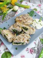 Drobiowe kieszonki ze szpinakiem, camembertem oraz sosem cytrynowym 263Delikatne drobiowe mięso faszerowane duszonym szpinakiem i camembertem to wspaniała propozycja na codzienny jak i świąteczny obiad, smaku dopełnia dodatek sosu cytrynowego. Doda energii na cały dzień.Polecam. Składniki: Na dwie osoby: 1 duży podwójny filet z kurczaka Garść świeżego szpinaku Kawałek pora 2 łyżki masła ½ krążka sera camembert Sól i pieprz do smaku Przyprawa ziołowa do kurczaka Olej