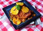 Udziec z indyka w pomarańczach 212Dzisiaj coś na świąteczny obiad ;) no dobra nie mus być świąteczny może być zwykły, ale wykwintny, przy tym prosty nie wymagający spędzenia całego dnia w kuchni. Jak ja to mówię minimum pracy maksimum efektu! W roli głównej udziec z indyka w otoczeniu pomarańczy! PYCHA! Składniki: 1 udziec z indyka z kością 2 pomarańcze 2 cebule marynata: keczup(...)mięso będzie miękkie ( od 1h do 2h). ok 20 min przed końcem pieczenia odkryj pokrywkę i połóż plastry pomarańcza na udźcu. Podawaj na ciepło do obiadu lub na zimno do chleba. Smacznego