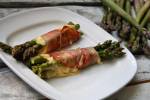SZPARAGI ZAPIEKANE Z SZYNKĄ PARMEŃSKĄ 214wykwintny obiad danie idealne. Proste, szybkie do przygotowania, a pyszne. Dziś to ja zaserwuję je moim synom na świąteczny obiad, może kiedyś zrobią je same, bo wiedzą że szparagi bardzo lubię Składniki:15 szparagów5 plastrów szynki parmeńskiej5 plastrów żóltego serasólWykonanie:Szparagom odłamujemy końcówki, wstawiamy do garnka z posolonymwrzątkiem, głowki stoją ponad poziom wody, gotują się naparze.Gotujemy 5 minut. WYjmujemy