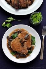Szynka duszona. 283Dzisiaj mam do zaproponowania duszoną szynkę. Idealna na niedzielny lub świąteczny obiad. Wspaniale smakuje podana z puree ziemniaczanym i gotowanymi buraczkami. Składniki: 1 kg szynki, sól, pieprz, papryka, tymianek, kmin rzymski, olej bulion warzywny 2 małe cebule, 3 ząbki czosnku, 350 g pieczarek Wieczorem na dzień przed gotowaniem szynkę marynujemy - mieszamy przyprawy z olejem i nacieramy mięso - wkładamy
