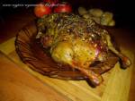 KACZKA PIECZONA, FASZEROWANA JABŁKAMI I ZIARNAMI. 263kuchnię starszej kucharki chodzi. Siedziałyśmy i porównywałyśmy to co pojawiało się na świątecznym stole u mamy, u taty i to co pojawia się u nas. Ponieważ wszystkim zaświeciły się oczy na myśl o ptaszysku pięknie ulokowanym na środku stołu postanowiłyśmy nie czekać do świąt i zaserwować na obiad kaczkę pieczoną. Jak zwykle nie mogłyśmy się dogadać co do wykonania, więc(...)dłuższych dyskusjach naszpikowałyśmy ją jabłkami, ziarnami i odrobiną miodu. Natarty przyprawami ptak, wypełniony dosłownie owocnym nadzieniem zaserwowałyśmy z pieczonymi w koszulkach ziemniakami, czosnkowym szpinakiem i sosem z żurawiny. Obiad (przed)świąteczny był pyszny. SKŁADNIKI:- Kaczka, około 2 kg,/Solanka do namoczenia:- woda,- sól,/Na każdy litr wody - 2 łyżki soli./Nadzienie:- Jabłka, 3 duże, - Ziarna:* "Euforia