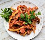 Fasolka szparagowa z pieczarkami w sosie pomidorowym 64Danie niemalże jednogarnkowe. Pyszna sezonowa fasola szparagowa (poza można użyć mrożonej), pieczarki, cebula, sos pomidorowy oraz parówki - które można pominąć. Składniki: 2 dobrej