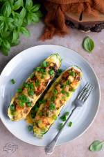 Cukinia faszerowana pieczarkami 206Cukinia to warzywo, które mam z własnego ogródka, dlatego bardzo często gości w mojej kuchni. Robię z jej udziałem różnego rodzaju sosy do makaronów czy placki. Cukinia faszerowana pieczarkami to kolejna moja propozycja na wykorzystanie tego warzywa. Jest to danie, które doskonale sprawdzi się na obiad czy kolację. Taka cukinia faszerowana pieczarkami jeszcze lepiej będzie smakować podana z ulubionym sosem(...)lubi. Ja cukinię faszerowałam już różnymi kombinacjami i przyznam, że za każdym razem smakuje wyśmienicie. Tak więc jeśli szukacie nowego pomysłu na obiad to mam nadzieję, że cukinia faszerowana pieczarkami przypadnie wam do gustu! (adsbygoogle = window.adsbygoogle || []).push({}); Składniki na Cukinię faszerowaną pieczarkami: 1 większa cukinia lub 2 mniejsze 1 nieduża biała cebula 200 g pieczarek 2 łyżeczki koncentratu pomidorowego