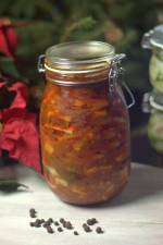Cukinia w zalewie octowo-musztardowej 203wody:1 litr gorącej wody 3/4 szklanki octu 10 %2 łyżki soli1 szklanka cukru7 łyżek musztardy miodowejkilka ziaren ziela angielskiegokilka liści laurowychkila ziaren czarnego pieprzu1 cała główka czosnku (polskiego)1 op. ziaren białej gorczycyWodę zagotowujemy z octem, cukrem i solą. Następnie dodajemy musztardę i dokładnie mieszamy. Cukinię (a także możemy robić ogórki albo patisony.) obramy ze skóry