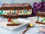 Kryształek - śmietanowiec z galaretkami 443Ciasto kakaowe typu murzynek, przełożone masą śmietanową z dodatkiem kolorowych galaretek. Na wierzchu z czekoladową polewą oraz kolorową posypką. Proste, pyszne i efektowne ciasto, które przyciąga
