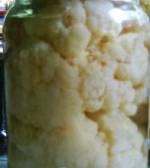 Kalafior na zimę 175cytryny, łyżeczkę soli. Zagotowujemy, gorącą zalewą zalewamy kalafior i zakręcamy słoiki. Pasteryzujemy pierwszego dnia 50 minut, drugiego dnia 25 minut. Taki kalafior najlepszy jest do sałatek ale moze stanowić samodzielny dodatek do obiadu. Można też go uzywać do zupy (bez zalewy