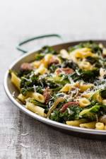 Makaron penne z chorizo i jarmużem 271Mężem bardzo polubiliśmy jarmuż. Jest to nasze odkrycie jesienno-zimowego sezonu i dopiero zaprzyjaźniamy się z tym warzywem. Jego lekko kapuściany smak odpowiada nam zarówno na surowo (np. w sałatce do libańskiego flatbreada z hummusem ), jak i w daniach na ciepło. I jeszcze te jego mocno karbowane ciemnozielone liście - czy nie są przepiękne? W weekend, jak na święto zakochanych przystało
