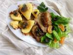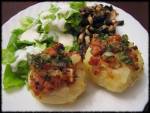 Zapiekane ziemniaki nadziewane mięsem mielonym z cebulą i ziołami 168być równiez plasterkach - wtedy kroimy go na mniejsze kawałki tak, żeby przykrył wierzch ziemniaków Przełożyć ziemniaki do naczynia żaroodpornego i piec w piekarniku 30-45 minut Podawać z ulubioną sałatką lub surówką i, np., innymi zapiekanymi warzywami. U mnie - pieczarka pokrojona w kostkę i lekko podsmażona. Smacznego