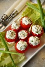 Pomidory faszerowane fetą 384GACA SPA. Pomidory faszerowane fetą na co dzień i od święta. Składniki: pomidory koktajlowe, 1op. sera feta, 1 łyżeczka jogurtu greckiego świeży szczypiorek, bazylia, oregano (do wyboru) zioła do sałatek (papryka, czosnek, różowy i czarny pieprz, por, bazylia, natka) Przygotowanie: Pomidory dokładnie myjemy i odcinamy z nich wierzch. Ze środka usuwamy pestki i miąższ. Wydrążone pomidorki delikatnie solimy i układamy