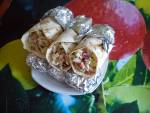 Tortilla, Naleśnik Meksykański 391dodać do tej samej miski, dodać mięso usmażone i sos czosnkowy oraz tzatziki. 6. Wymieszać wszystko łyżka i... 7. Placki podgrzać na patelni, potem na talerzu poukładać sałatkę z sosem i zwinąć