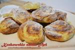 Ślimaczki z serem. 239waniliowym i żółtkami, następnie dodać ubite białka i delikatnie wymieszać.Masę serową przygotować dopiero przed rozwałkowaniem ciasta bo zrobi się rzadka jeśli długo postoi. Wyrośnięte ciasto rozwałkować na stolnicy, wycinać pasy o szerokości około 8 cm, nałożyć trochę sera i dobrze rozprowadzić po cieście, zwinąć w roladę, odcinać 5 cm kawałki. Piec w temperaturze 180 stopni na złoty kolor