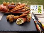 Grillowa rolada z kurczaka z serkiem i pastą z rukoli, podana z ziemniakami i słodkimi marchewkami 283czarny do smaku, 1 łyżeczka cukru trzcinowego, olej rzepakowy. Przygotowanie: Serowe nadzienie: Pestki ze słonecznika prażymy na suchej patelni i studzimy. Rukolę, oliwki, słonecznik i sok z cytryny miksujemy na gładką masę za pomocą blendera. Dodajemy serek kremowy, mieszamy łyżką do połączenia się składników, doprawiamy pieprzem, ewentualnie solą. Rolada z kurczaka: Filety z kurczaka myjemy, przekrawamy na dwie równe płaskie