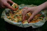 Chlebki z cebulowo-serowym nadzieniem | mata-stolnica z podziałką hiszpańskiej marki Lekule 222może po zredukowaniu ilości nadzienia, będą bardziej zwarte, ale kto by rezygnował z cebulowo-serowego nadzienia?? ;) Dlatego ja zrobiłam je w postaci mini chlebków. 'chlebki z cebulowo-serowym nadzieniem' Składniki (na 4 mini chlebki): - 4,5 szklanki mąki pszennej - 1 op. drożdży instant (7g / 3 łyżeczki) - 2 łyżeczki soli - 2 łyżeczki cukru - 0,5 szklanki mleka - 1 szklanka(...)roladę (zdjęcie poniżej). Każdą roladę dzielimy na pół. Następnie ustawiamy na blasze, wyłożonej papierem do pieczenia, połówki chlebków w pionie, przekrojoną częścią ku górze. Przykryć ściereczką i odstawić na 45 minut w ciepłe miejsce. Piec w 220C przez ok. 35-40 minut, uważać, żeby nie spalić cebuli. Smacznego! ___________________________ /*wpis zawiera lokowanie produktu/ Chlebki z cebulowo-serowym nadzieniem, postanowiłam upiec przy