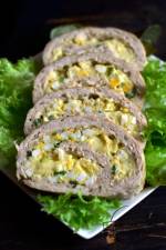 Drobiowa rolada z jajkami i serem 283powiecie na drobiową roladę (pieczeń) z posiekanymi jajkami i serem, zamiast tradycyjnej pieczeni rzymskiej? Moim zdaniem to miła odmiana. Lżejsza, delikatniejsza, ciekawsza. Baaardzo smaczna. Smakuje zarówno na ciepło (doskonała z sosem pieczarkowym jak i pomidorowym), jak i na zimno (do sałatki, czy na kanapkę,polana ketchupem). Może wypróbujecie na Wielkanoc? 750 g mielonego mięsa drobiowego (u mnie udka bez skóry(...)Dokładnie wyrabiamy. Na blacie rozwijamy kawałek papieru do pieczenia, delikatnie smarujemy go olejem. Rozprowadzamy na nim mięso mielone, tworząc prostokąt. Mięso posypujemy tartą mozzarellą. Rozkładamy farsz jajeczno-serowy. Dokładnie zwijamy w roladę pomagając sobie papierem. Mięso przekładamy na blaszkę wyłożoną papierem do pieczenia. Wstawiamy do piekarnika nagrzanego do 180 stopni na około 50-60 minut. Pod koniec pieczenia odkrywamy papier