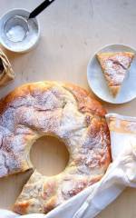 Kołocz śląski z serem 256dodać ser, mielone migdały, skórkę z pomarańczy, namoczone rodzynki i mąkę. Całość wymieszać. Wyrośnięte ciasto rozwałkować w kształcie prostokąta o wymiarach 50x20 cm. Na ciasto nałożyć masę serową i zawinąć jak roladę. Brzegi rolady złączyć ze sobą i położyć na blasze wyłożonej papierem do pieczenia. Z ciasta uformować koło, a do jego środka włożyć małą okrągłą blaszkę (lub inne naczynie