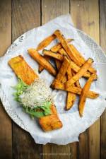 Łosoś z frytkami z batatów 325Piekarnik rozgrzewamy do 220°C. Bataty/pataty obieramy za pomocą obieraczki i kroimy na grube frytki. Wrzucamy do dużej miski. Do małej miseczki lub filiżanki wlewamy trzy łyżki oleju. Dodajemy do niego przyprawy: słodką paprykę, tymianek, granulowany czosnek, mieloną kolendrę, sól oraz chilli. Mieszamy i wlewamy do słodkich ziemniaków. Mieszamy, aż wszystkie frytki oblepią się przyprawami. Dużą blachę (od piekarnika(...)wykładamy papierem do pieczenia. Wsypujemy frytki. Wkładamy do nagrzanego piekarnika i pieczemy 30 minut. Łosoś : Z łososia zdejmujemy skórę (jeśli posiada). Wszystkie przyprawy (słodką paprykę, cukier, tymianek, kurkumę, chilli i sól) rozcieramy w moździerzu na pył. Dodajemy dwie łyżki oleju i mieszamy. Wlewamy marynatę do foliowej torebki. Wkładamy do środka rybę. Potrząsamy dokładnie torebką, aż cała ryba będzie w przyprawach