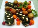 mintaj pieczony ze szpinakiem i fetą 222Zdrowe, lekkie danie z piekarnika. Idealne na obiad lub kolację. Składniki: 4 filety z mintaja 300 g szpinaku 2 ząbki czosnku 2 łyżki śmietany 1 łyżka masła 2 plasterki sera feta sól pieprz pieprz cytrynowy Rybę ułożyć na blaszce do pieczenia. Posypać solą i pieprzem cytrynowym. Szpinak usmażyć na maśle, dodać czosnek, sól i pieprz a na końcu śmietanę