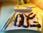 dorsz smażony na maśle z bakłażanem i leśnymi grzybami 179Dorsz smażony na maśle z bakłażanem i leśnymi grzybami Aromat duszonych leśnych grzybów i pieczonego bakłażana doskonale współgra ze smażoną na maśle delikatną morską rybą. Składniki dla czterech osób 2 średnie dorsze lub 800 g filetów ze skórą 250 g świeżych leśnych grzybów 1 cebula (najlepiej cukrowa) 1 spory bakłażan 5 łyżek masła 9 łyżek oliwy sól, pieprz(...)piekarnika nagrzanego do 180 stopni. W tym czasie na oddzielną patelnię kładziemy trzy łyżki masła z łyżką oliwy, rozgrzewamy patelnię uważając, aby nie spalić masła i smażymy na niej z obu stron filety dorsza, zawsze zaczynając smażenie od strony ze skórą. Na każdy talerz wykładamy po dwa plastry pieczonego bakłażana, układamy na nich usmażone na maśle kawałki ryby