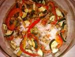 Pieczony dorsz z warzywami 297pokrojone warzywa. Całość posyp przyprawami. Jeśli chcesz, możesz wetrzeć je w rybę (ja wole gdy to warzywa są bardziej doprawione). Teraz wystarczy już tylko wlać do naczynia trochę wody – tak, by przykryć spód naczynia, przykryć naczynie pokrywką bądź folią aluminiową i koniec roboty, danie wędruje do piekarnika ;) Piec w 200ºC około 15-20 minut, zdjąć pokrywkę i piec jeszcze