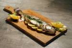 Pieczony pstrąg 187wymieszać. Odrobinę posolić i popieprzyć, Formę wyłożyć folią, ułożyć na niej rybę, którą należy z obu stron posolić. Do otworu brzusznego nałożyć masło ziołowe oraz plastry cytryny. Rybe posmarować delikatnie masłem i wstawić przykrytą folią do nagrzanego piekarnika (180stopni) na ok 25-30 minut. Bardzo smaczna z pieczonymi ziemniaczkami. Smacznego