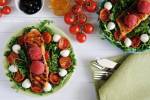 Łosoś norweski z sorbetem truskawkowym na sałatce z pieczonymi pomidorkami 214octem balsamicznym oraz solą i pieprzem. Do szczelnie zamykanego pojemnika wsadzić kawałki ryby. Zalać przygotowaną marynatą. Pojemnik zamknąć, odstawić do lodówki na 2 godziny. Od czasu do czasu odwrócić na chwilę pojemnik do góry dnem. Zamarynowanego łososia grillować po 3-4 minuty z obu stron. Sałatka z pieczonymi pomidorami i mozzarellą 16 niedużych pomidorków 1 ząbek czosnku 4 łyżki(...)lodówki) na 20 minut. Pomidory rozłożyć na tacce do grillowania, przykryć drugą i grillować przez 15-20 minut. Można też ułożyć na blasze i upiec w piekarniku w 180°C Do soku, który zebrał się w misce po pomidorach dodać pozostałą oliwę. Doprawić octem, solą i pieprzem. Rukolę opłukać i osączyć. Mozzarellę osączyć z zalewy. Na talerze rozłożyć po porcji