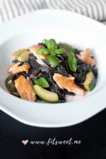 Makaron z pieczonym łososiem 239smaku wersja makaronu zadowoli podniebienia nawet najbardziej wrażliwych wielbicieli dobrego smaku. Składniki (4 porcje): Makaron: 250 g czarnego makaronu tagliatelle (u mnie barwiony sepią, który doskonale komponuje się z rybami i owocami morza) 1 (ok. 300 g) młoda cukinia 1 czerwona cebula 1 ząbek czosnku 2 łyżki oleju 3 łyżki sosu sojowego 1 łyżka miodu 2 łyżki soku z limonki(...)osuszyć, usunąć ości, polać przygotowaną marynatą w naczyniu żaroodpornym i przykryty folią spożywczą odstawić na około 1h lub dłużej. 3) Po tym czasie piec w piekarniku nagrzanym do 180 stopni przez 20 min. (najlepiej kontrolować proces pieczenia i dostosować czas, ponieważ filet z łososia może mieć różną grubość), a następnie usuwamy skórę wraz z brązową częścią (tłuszczem) i dzielimy łososia