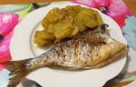 Dorada z oliwą z oliwek i czosnkiem 170Witam, moi drodzy dziś prezentuję wam przepis na pieczoną doradę doprawioną oliwą z oliwek i czosnkiem. Doskonałe połączenie smaku z tą delikatną rybką. Gorąco polecam na piątkową rybkę. Ten przepis jaki i inne można znaleźć w lewym bocznym pasku! Dorada z oliwą i czosnkiem Gotowa dorada podana z opiekanymi ziemniaczkami. Podczas zjadania można sobie doradę polewać oliwą(...)Czosnek kroimy w plasterki i wkładamy w nacięcia w doradach i w środek ryby. Następnie dorady nacieramy oliwą z oliwek i doprawiamy solą i pieprzem dokładnie z każdej strony oraz wewnątrz. Wkładamy dorady do naczynia żaroodpornego i odstawiamy na 1 h i następnie wstawiamy do piekarnika na 30 min w temp 180. Po 30 min ściągamy pokrywę z naczynia włączamy