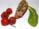 Pieczony batat z tuńczykiem z purée z groszku i pomidorkami 171Mieszanka wzorów i kolorów na talerzu 🍴 podana, wiec uczta będzie gwarantowana 😊, bo najpierw jemy oczami 👀, a następnie ustami 👄. Danie, do tego jeszcze