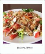 Sałatka z grillowanym kurczakiem 195Rewelacyjna sałatka, szybka w przygotowaniu, smaczna, kolorowa i zdrowa. Idealna na obiad, kolacje, przekąskę w pracy itd. Sałatka będzie miała u mnie jeszcze wiele odsłon i wszystkie będą pyszne, bo cały sekret to dressing - Monia dziękuję. Potrzebujemy: Garść mix'u sałat 1 pierś z kurczaka 1 pomidor 2 łyżki kiełków sojowych 2 łyżki pestek dyni 1 łyżka otrębów