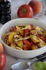 Brzoskwiniowo-pomidorowa sałatka z serem halloumi 3104.09.2025 Magda Soczyste, letnie brzoskwinie i dojrzałe pomidory to duet, który zaskakuje swoją harmonią – słodycz owoców spotyka się tu z lekkością warzyw. Do tego cienkie piórka