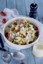 Sałatka z makaronem, ośmiorniczkami i zielonym groszkiem! 290Dzisiaj propozycja zupełnie niedietetyczna ;-). Sałatkę robiłam dla mojego K., który uwielbia wszystkie sałatki z dodatkiem majonezu i makaronu, czyli te których ja unikam jak ognia ;-). Sałatkę przygotowałam z włoskiego makaronu w kształcie muszli, które wyglądem nawiązują do smaku sałatki, składnikiem nadającym wyrazisty aromat i smak, są ośmiorniczki. Dodałam również niezastąpiony do sałatek -zielony groszek i ekologiczne jajka. Sałatka