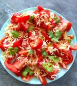 Sałatka z pomidorów i papryki 35Czasem żeby przygotować sałatkę potrzebujemy naprawdę niewiele. Mi tym razem wystarczyły tylko pomidory, papryka i odrobina sera, którą znalazłam w lodówce. Niby nic, a kolacja gotowa