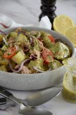 Ziemniaczana sałatka z tuńczykiem 5620.08.2025 Magda Sałatka ziemniaczana z tuńczykiem, pomidorami, cebulą i oliwkami to pełna smaku i charakteru propozycja na letni obiad, kolację lub piknik. Klasyczne składniki łączą się